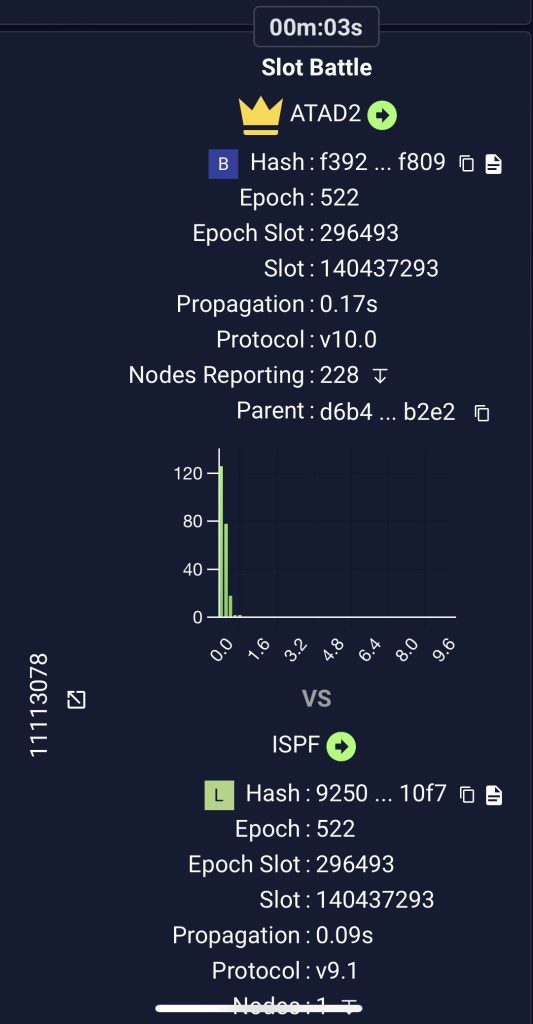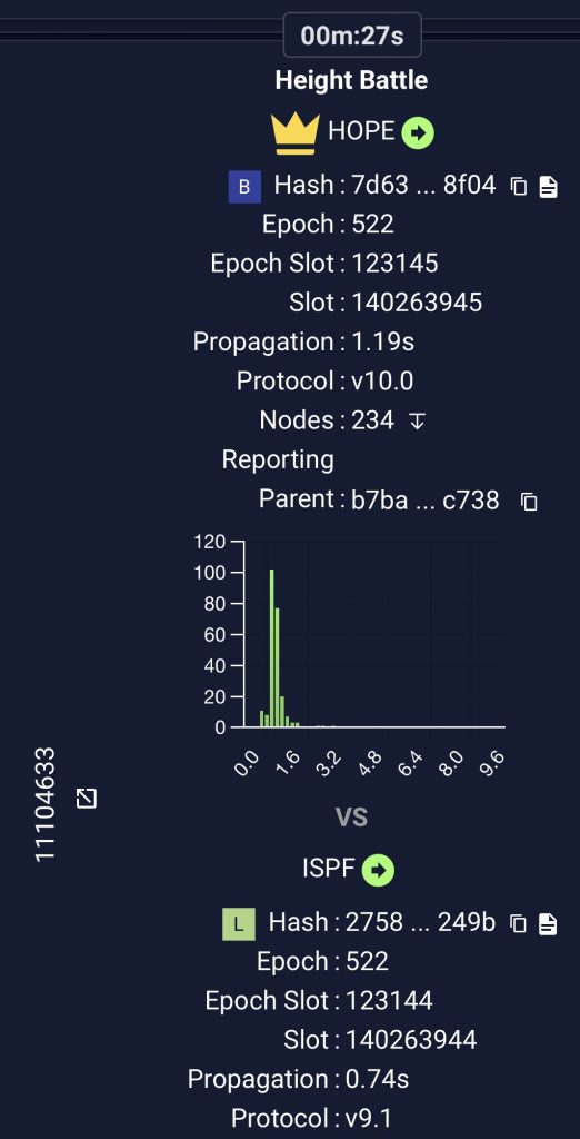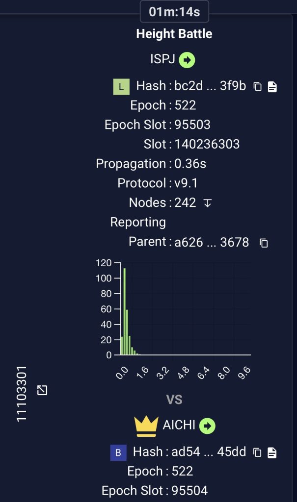 このことから、1秒~3秒前後に複数のプールで割り当てられたスケジュールで発生しやすく、分散化の観点からプール間の地理的優位性を無くすためにVRF値による判定で採用ブロックが決定されます。