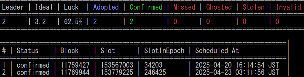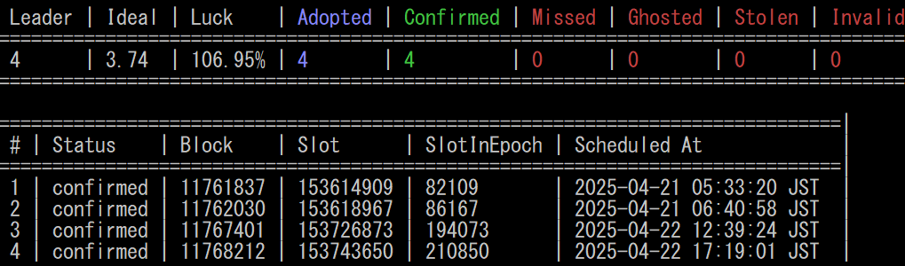当プールでは、各サーバーを厳格に管理し、[Missed]ゼロの運営を継続中。ブロック割り当ての変動はありますが、期待値の高いエポックでは確実に報酬をお届けできるよう努めております。