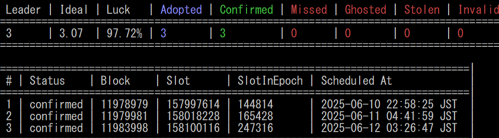 当プールでは、各サーバーを厳格に管理し、[Missed]ゼロの運営を継続中。ブロック割り当ての変動はありますが、期待値の高いエポックでは確実に報酬をお届けできるよう努めております。