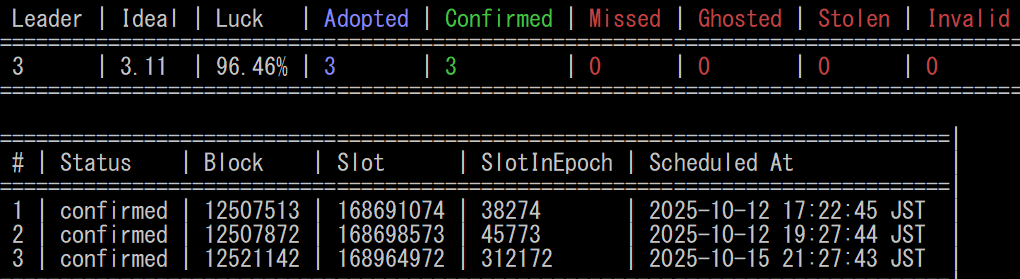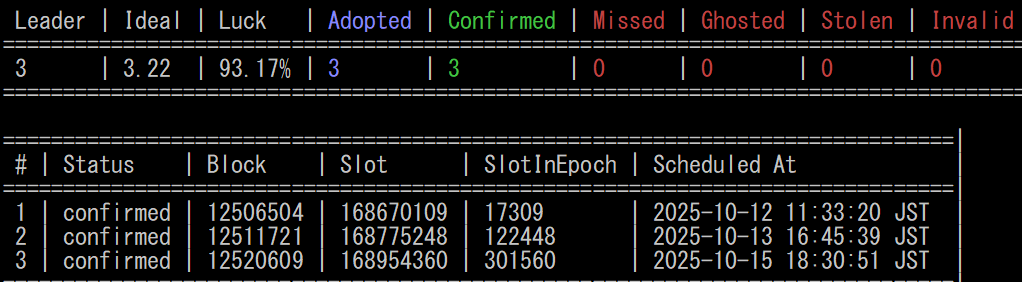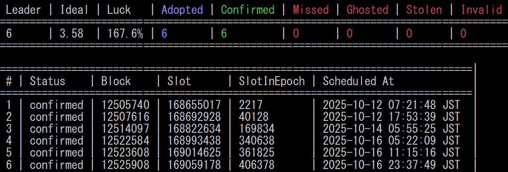 当プールでは、各サーバーを厳格に管理し、[Missed]ゼロの運営を継続中。ブロック割り当ての変動はありますが、期待値の高いエポックでは確実に報酬をお届けできるよう努めております。