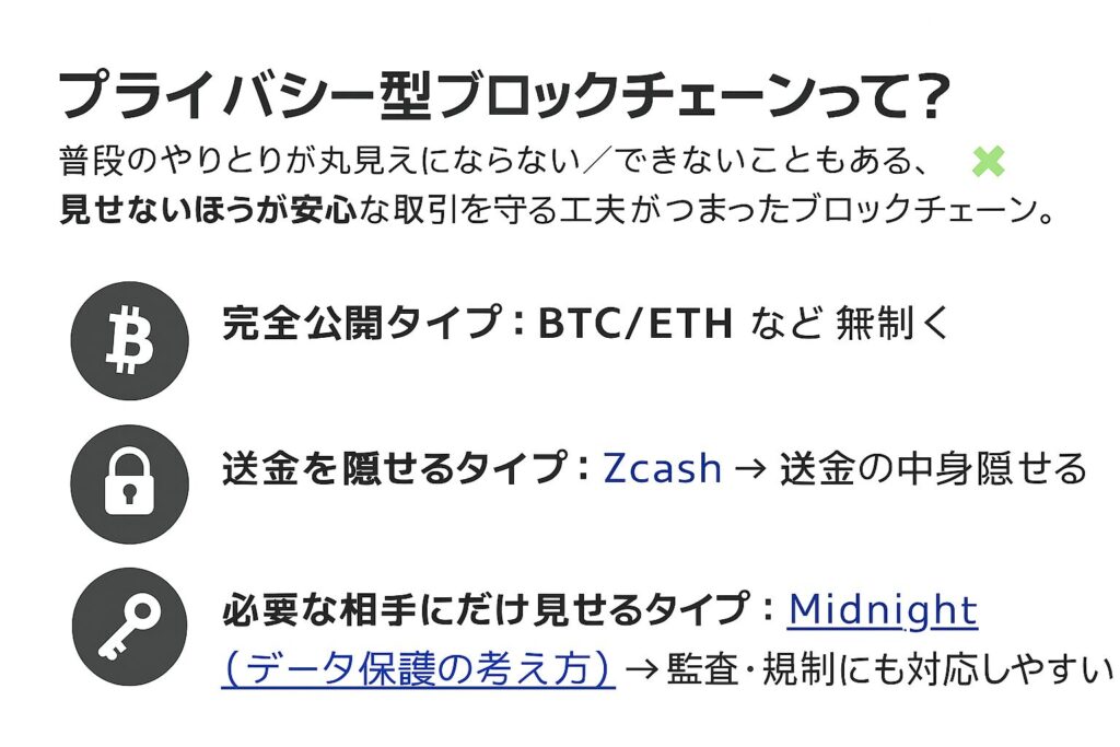 通常のブロックチェーンは「だれがいくら送ったか」が丸見えです。でも、仕事・医療・給与などは見せないほうが安全なこともあります。ここで活躍するのがプライバシー型チェーンです。