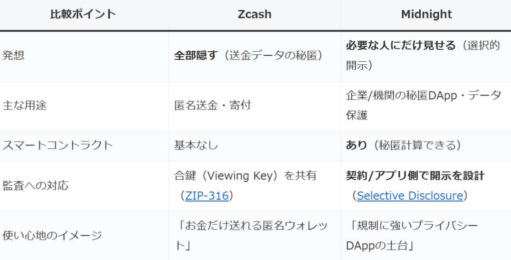 できます(Viewing Key)。ただし送金履歴の閲覧用です(ZIP‑316)。一方、Midnightはアプリ/契約レイヤで「誰に何をどこまで見せるか」を設計できます(公式ブログ)。