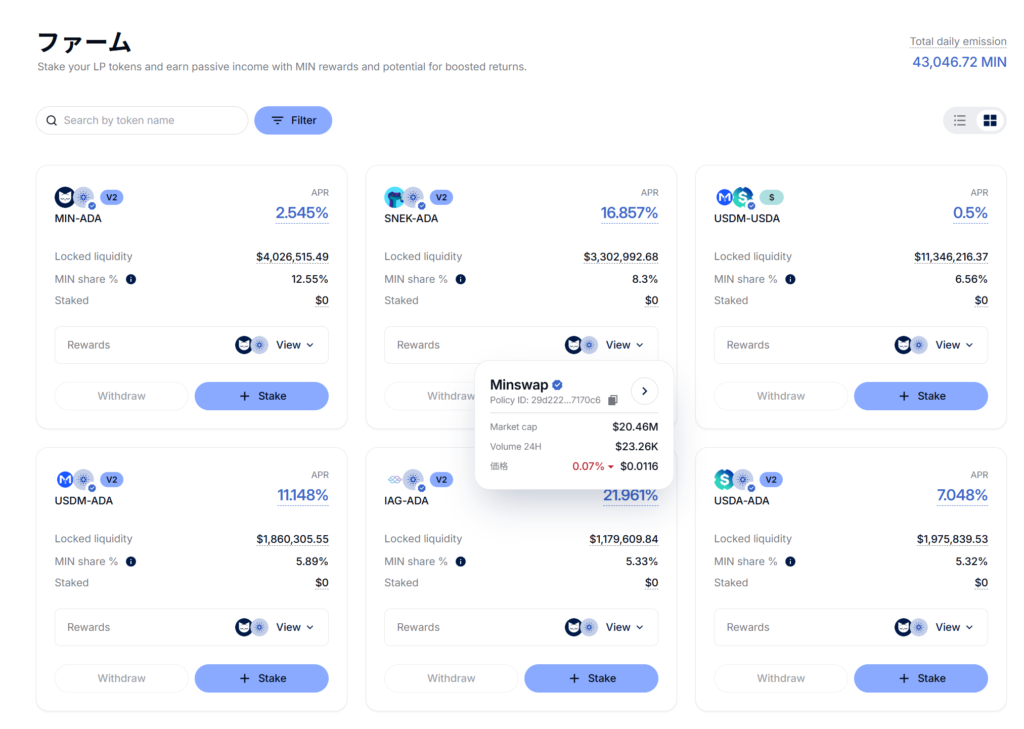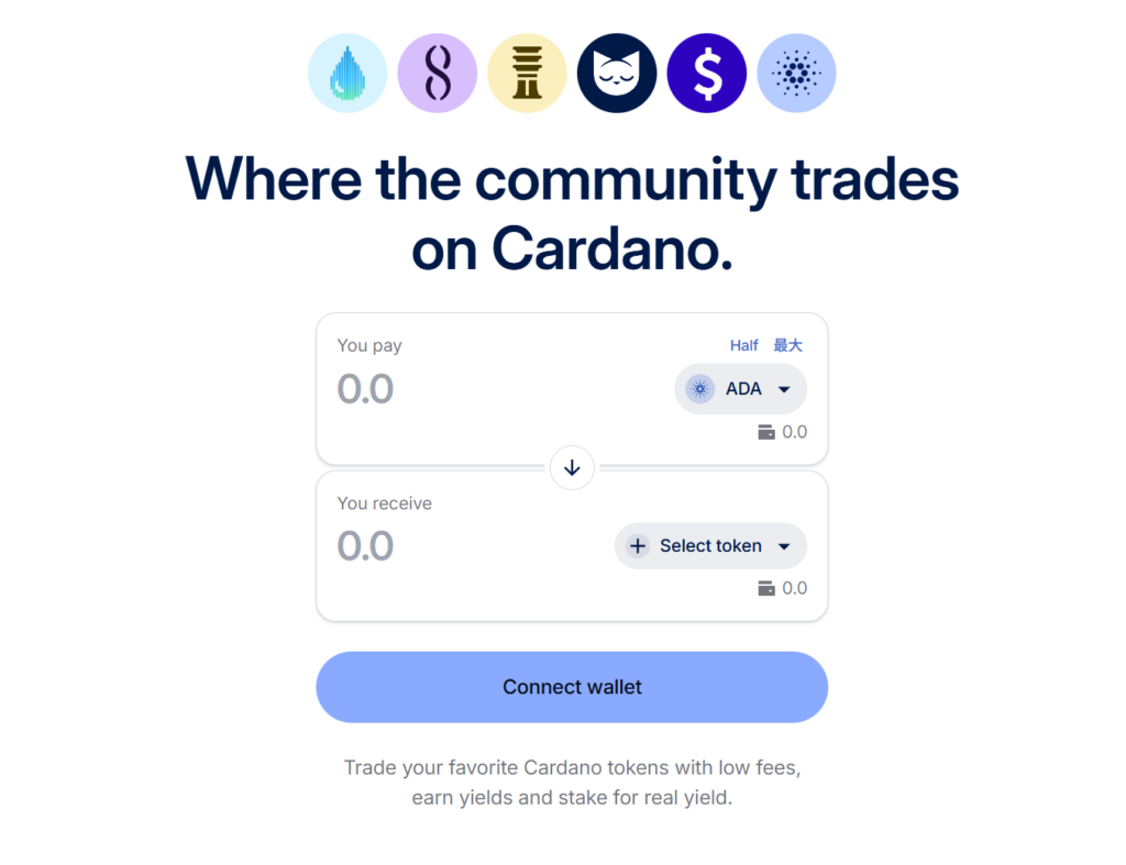 - Minswap = Cardano最大級の分散型取引所(DEX)。ウォレット接続だけでトークン交換・利回り運用が可能。