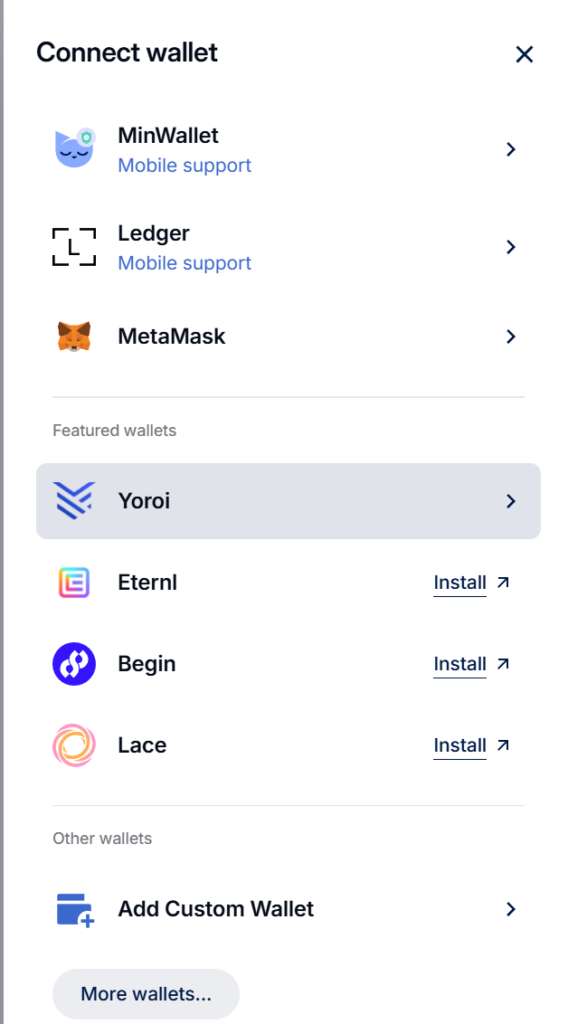 対応ウォレット(例):Eternl / Yoroi / Lace(ブラウザ拡張推奨)