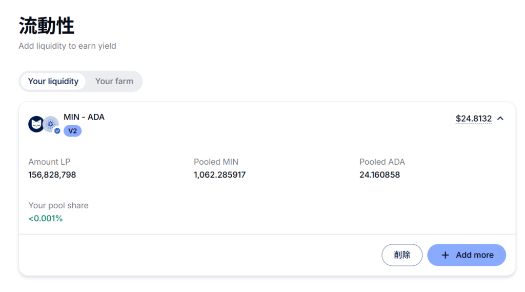 - Your liquidity に Amount LP / Pooled MIN / Pooled ADA / 持ち分% が表示されます。