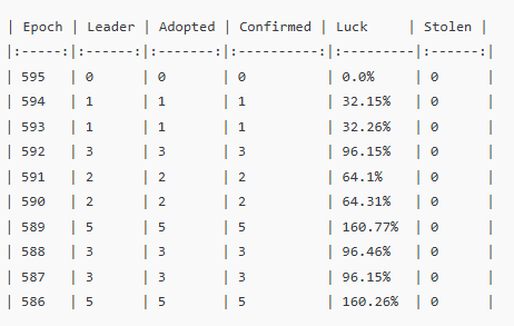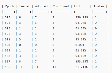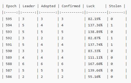 直近10エポック(595〜586)では、当プールに割り当てられた Leader 25回すべてのブロック生成に成功し、確定率も100% でした。